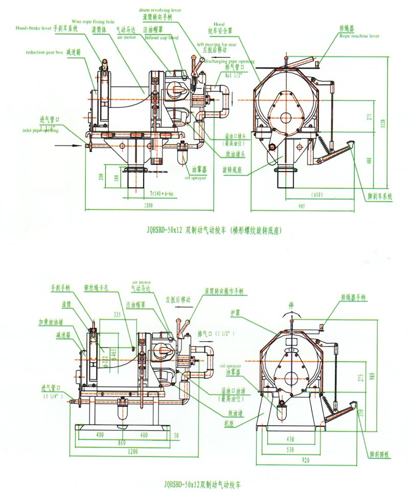 JQHSBD50x12登录入口,采用压缩空气为动力,推动TMH17活塞式气动马达工作。再通过二级齿轮减速,把扭矩传给滚筒。 登录入口的操纵.是靠马达体上的手操纵转向阀实现正转、反转、停止等项动作。为保证登录入口的安全性,该登录入口还 具有手、脚双重刹车功能。特别适用于矿山、建筑工程以及海上、陆地油田钻井平台上使用。