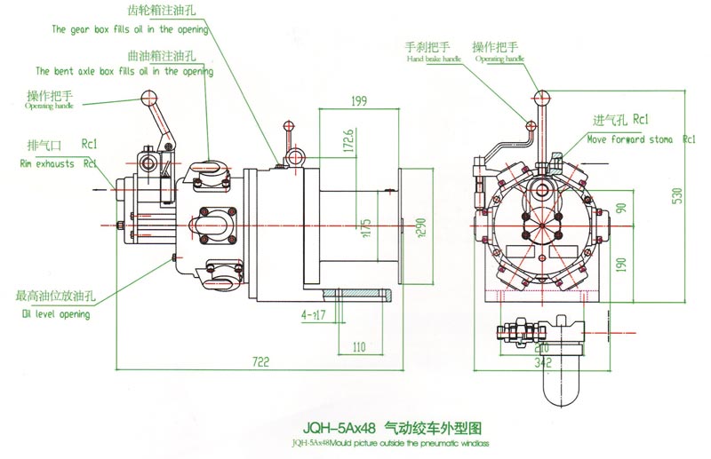 JQH-5Ax48登录入口,采用压缩空气为动力,推动TMH4A活塞式气动马达工作。再通过二级齿轮减速,把扭矩传给滚筒。气动绞 车的操纵.是靠马达体上的手操纵转向阀实现正转、反转、停止等项动作。为保证登录入口的安全性,该登录入口还具有手刹车功能。特 别适合于矿山、建筑工程以及海上、陆地油田钻井二层平台上之用。