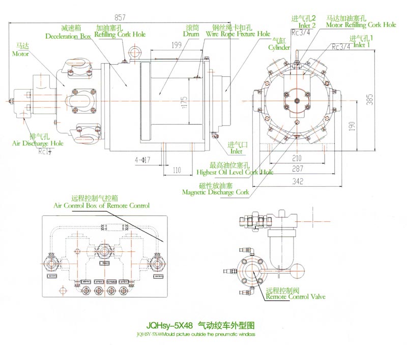 JQHSY-5X48远程控制登录入口,采用压缩空气为动力.推动TMH4A活塞式气动马达工作。再通过二级齿轮减速把扭矩传给滚筒。登录入口的操纵,是靠远程手操纵转向阀实现正转、反转、停止等项动作的。为保证登录入口的安全性,该登录入口还具有停车刹车功能。特别适于海上、陆地油田钻井二层平台上拖拉钻杆及套管之用。